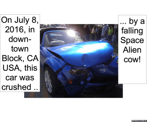 CAR CRUSHED BY SPACE ALIEN COW
