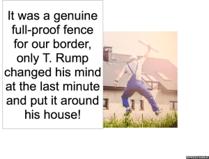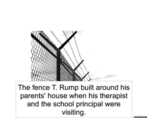 Uncategorized by eths05/24/201720:1305/24/2017 The Overly Long and Potentially Boring Story of T. Rump – Part Twelve THE FOLLOWING NARRATION IS WHOLLY, TRULY, AND REALLY BASED ON FACT. Here is the story about the fence T. Rump constructed when he was twelve years old: Owner of Escaping Ball: Share this:TweetLike Loading... Related